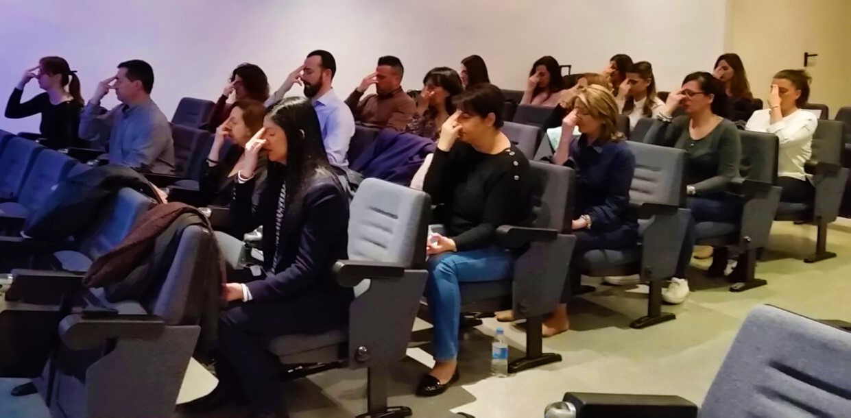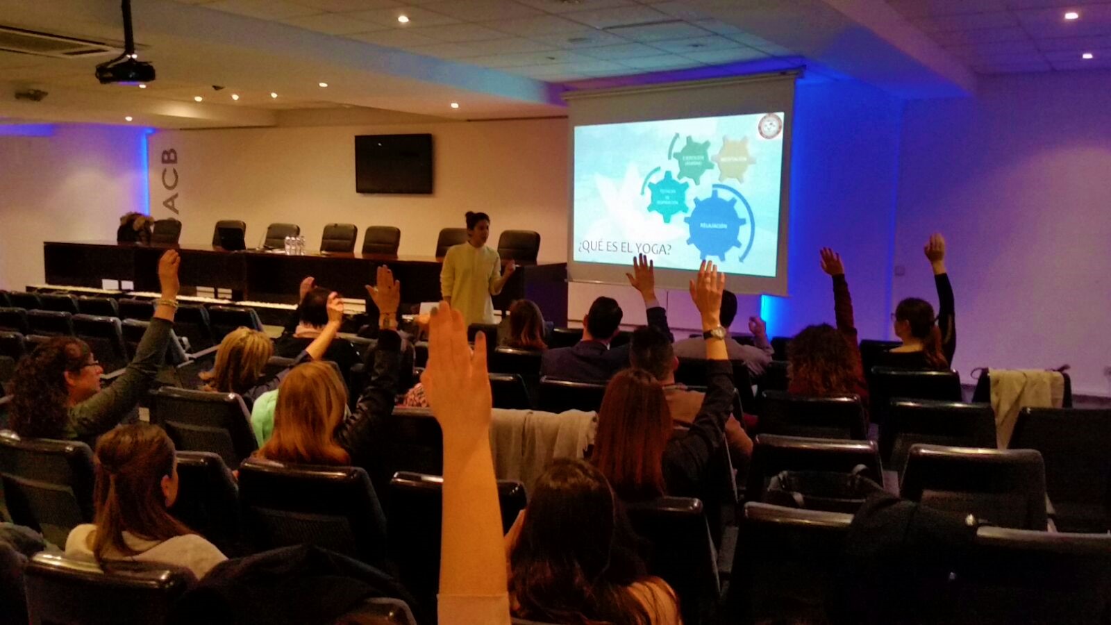 EL taller tuvo una primera parte más teórica, en la que explicamos el significado del Yoga, y los beneficios y aplicaciones que puede aportar la práctica regular de Yoga en la Vida Cotidiana en personas que trabajan en el mundo de los negocios.